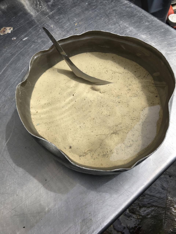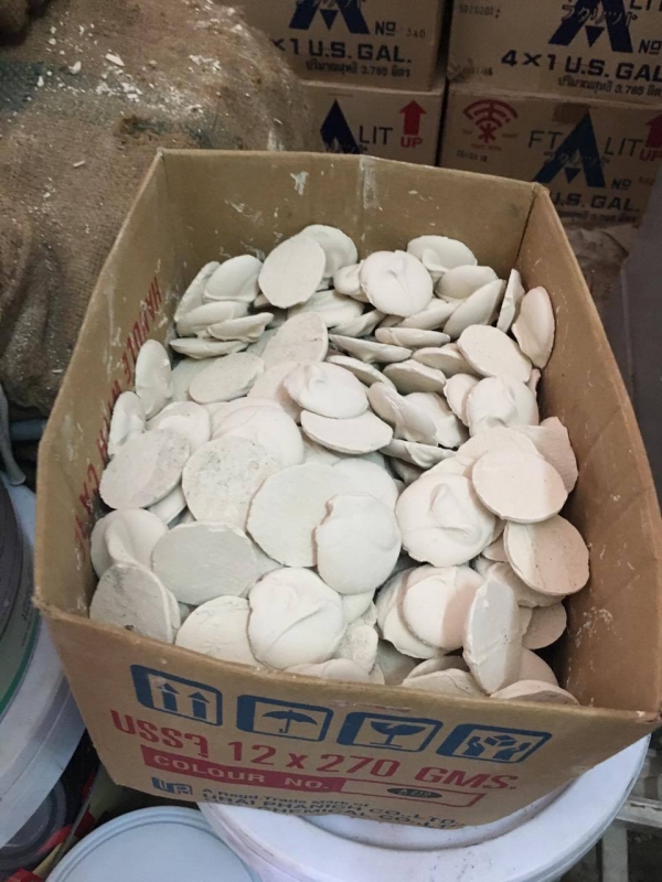 ตอนบนจะเป็นน้ำใส ค่อยๆ ช้อนเอาน้ำใสนี้ออกจากตุ่ม จนเหลือแต่แป้งดินขาวข้นเหมือนดินโคลน
