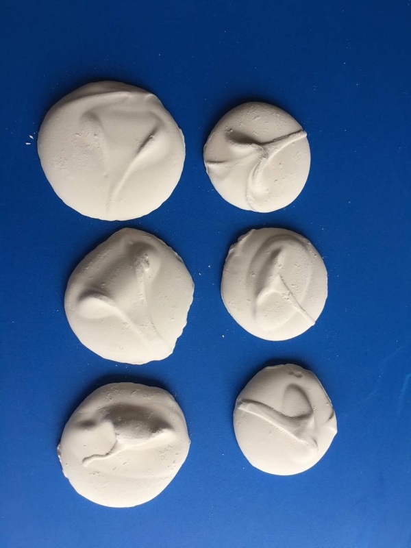 3. ตักโคลนดินสอพอง หยอดดินสีพองให้เป็นแผ่นกลมลงบนแผ่นไม้ที่เตรียมไว้