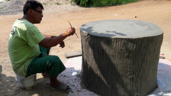 3. เขียนลายเปลือกไม้ หรือเนื้อไม้ ลงบนปูนที่ขึ้นรูปไว้