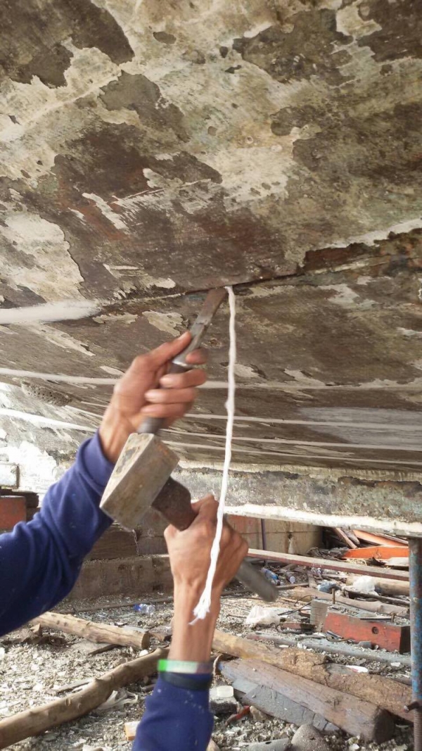 5. ใส่ด้ายดิบหรือไหมฟ้าอุดไปที่แนวเรือที่งัดออก โดยใช้ขวานกับสิ่วตอกแนวที่ใส่ด้ายกับไหมฟ้าให้แน่น