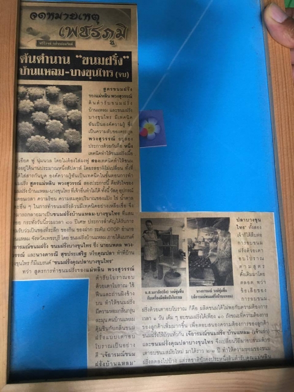 ขนมฝรั่งแม่หลิน เริ่มแรกทำขายภายในบ้าน หมู่ที่ 7 บ้านศาลเจ้าตึก เมื่อราวปีพ.ศ. 2475 หรือเมื่อประมาณ 80 ปีมาแล้ว ได้รับความนิยมมาอย่างต่อเนื่อง ต่อมาได้สืบทอดยังลูกๆ ทั้ง 8 คน ได้แก่ นางเพิ้ง พวงสุวรรณ์ นายจำลอง พวงสุวรรณ์ น.ส.แผ่ว พวงสุวรรณ์ นางจี๊ด แสงมงคล นายจรูญ พวงสุวรรณ์ น.ส.สาคร พวงสุวรรณ์ น.ส.เครือ (ป้าแจ๋ว) พวงสุวรรณ์ ปัจจุบันอายุ 92 ปี โดยเฉพาะน.ส.แผ่ว น.ส.เครือ (ป้าแจ๋ว) และนายจรูญ ได้ทำขนมฝรั่งสูตรคุณแม่หลิน ภายหลังนายจรูญ แยกออกมาทำส่วนตัวในช่วงสั้นๆ ก็เลิก ทว่านายดำรง และนายนภดล บุตรชายทั้งสองของนายจรูญ ได้ฝึกหัดทำขนมฝรั่ง สืบต่อมา นายดำรง และภรรยา (เจ๊อารมณ์ วงษ์ชุ่มชื่น) ทำขนมฝรั่งที่บ้านแหลม ขณะที่นายนภดล แยกไปทำขนมฝรั่งที่บ้านภรรยา (บางขุนไทร) เบื้องหลังการทำขนมฝรั่งบ้านแหลม และบางขุนไทร ที่มีชื่อเสียงในปัจจุบัน