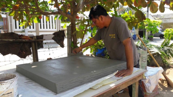 3. เขียนลายเปลือกไม้ หรือเนื้อไม้ ลงบนปูนที่ขึ้นรูปไว้