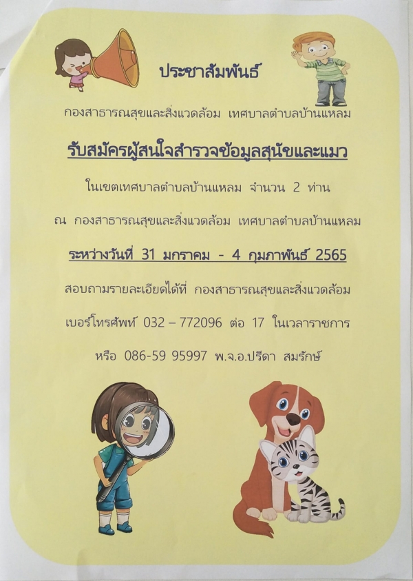 รับสมัครผู้สนใจสำรวจข้อมูลสุนัขและแมวในเขตเทศบาลตำบลบ้านแหลม