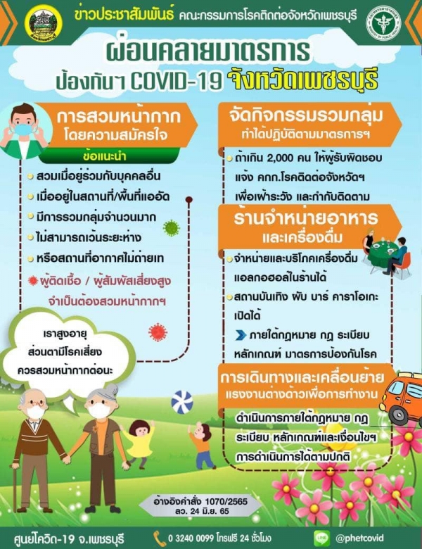 คำสั่งจังหวัดเพชรบุรี ที่1070/2565 เรื่องการผ่อนคลายมาตรการโควิด ในเขตพื้นที่จังหวัดเพชรบุรี มีผลบังคับใช้ ตั้งแต่ 24มิ.ย.65 เป็นต้นไป