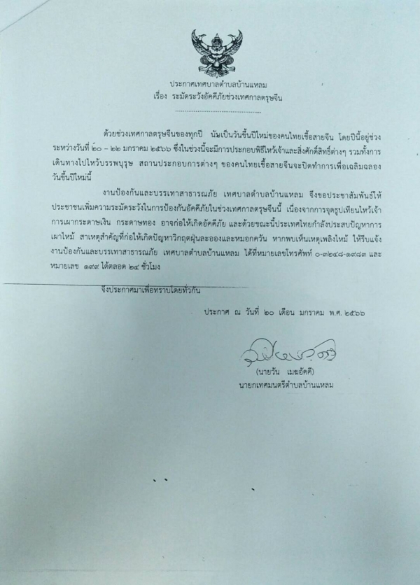 ประกาศเทศบาลฯ เรื่องระมัดระวังอัคคีภัยช่วงเทศกาลตรุษจีน