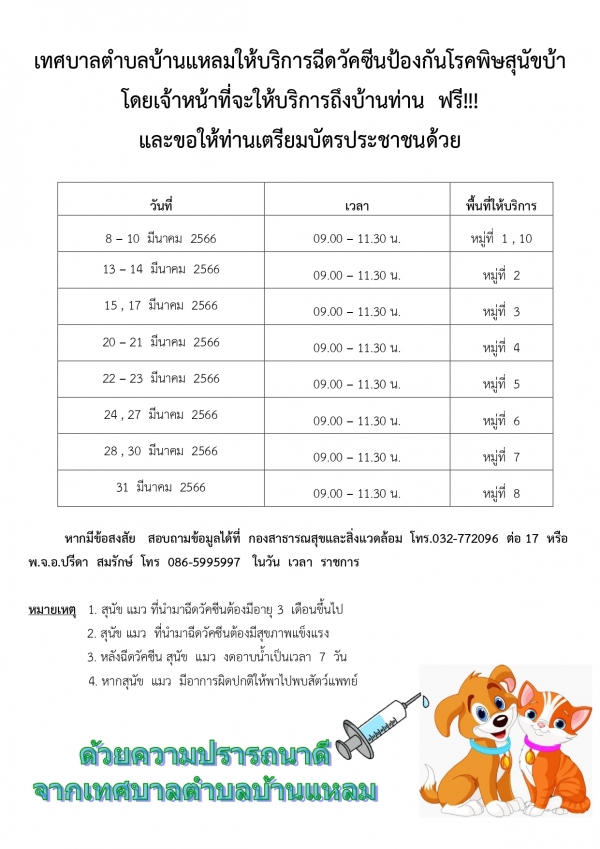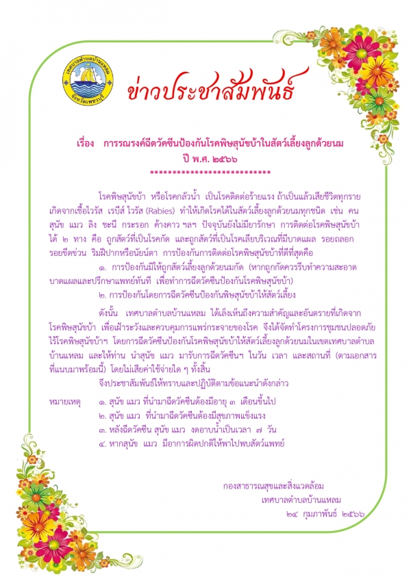 เทศบาลตำบลบ้านแหลมได้เล็งเห็นถึงความสำคัญ และอันตรายที่เกิดจากโรคพิษสุนัขบ้า เพื่อเฝ้าระวังและควบคุมการแพร่กระจายของโรค จึงได้จัดทำโครงการชุมชนปลอดภัยไร้โรคพิษสุนัขบ้าฯ โดยการฉีดวัคซีนป้องกันโรคพิษสุนัขบ้าให้สัตว์เลี้ยงลูกด้วยนมในเขตเทศบาลตำบลบ้านแหลม และให้ท่านนำสุนัข และแมว มารับการฉีดวัคซีนฯ ในวัน เวลา และสถานที่ (ตามเอกสารด้านล่างค่ะ) โดยไม่เสียค่าใช้จ่ายใด ๆ ทั้งสิ้น
