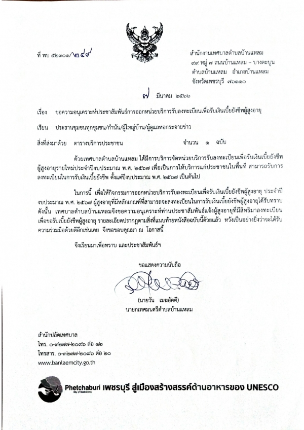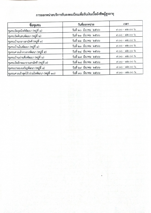ประชาสัมพันธ์การออกหน่วยบริการรับลงทะเบียนเพื่อรับเงินเบี้ยยังชีพผู้สูงอายุ