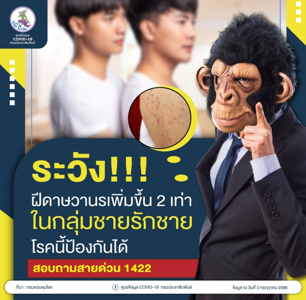 ระวัง!!! ฝีดาษวานรเพิ่มขึ้น 2 เท่าในกลุ่มชายรักชาย โรคนี้ป้องกันได้ สอบถามสายด่วน 1422 นายแพทย์ธเรศ กรัษนัยรวิวงค์ อธิบดีกรมควบคุมโรค กล่าวว่า โรคฝีดาษวานรเป็นโรคติดต่ออุบัติใหม่ของประเทศไทย ในเดือนมิถุนายน 2566 จำนวน 48 ราย ซึ่งสูงกว่าเดือนพฤษภาคมที่ได้รับรายงาน 21 ราย หรือจำนวนเพิ่มขึ้นเป็น 2.3 เท่า ผู้ป่วยส่วนใหญ่เป็นกลุ่มชายที่มีเพศสัมพันธ์กับชาย โดยสามารถตรวจสอบอาการเบื้องต้นได้ด้วยตนเอง หากมีผื่น/ตุ่มขึ้นบริเวณอวัยวะเพศ ทวารหนัก ปาก หรือตามร่างกาย และมีประวัติสัมผัสใกล้ชิด/แนบชิด หรือมีเพศสัมพันธ์กับผู้สงสัยฝีดาษวานร หรือผู้ป่วยฝีดาษวานร รวมทั้งกลุ่มผู้ดูแลผู้ป่วยสงสัยหรือเป็นฝีดาษวานรในขณะป่วย ให้สังเกตภายหลังสัมผัสผู้ป่วยภายใน 21 วัน หากมีอาการ ไข้ ปวดศีรษะ ปวดเมื่อยกล้ามเนื้อ หรือ ปวดหลัง ต่อมน้ำเหลืองโต เช่น บริเวณหลังหู คอ ขาหนีบ เจ็บคอ คัดจมูก หรือ ไอ มีผื่น หรือตุ่มน้ำ หรือตุ่มหนอง ขึ้นบริเวณอวัยวะเพศ หรือทวารหนัก หรือบริเวณรอบๆ ตามมือ เท้า หน้าอก ใบหน้า หรือบริเวณปาก ให้รีบเข้ารับการตรวจที่สถานบริการสุขภาพ หรือโรงพยาบาล โดยแจ้งอาการและประวัติเสี่ยงทันที พร้อมแนะนำวิธีป้องกันการติดเชื้อโรคฝีดาษวานร เช่น หลีกเลี่ยงการมีเพศสัมพันธ์กับคนแปลกหน้าที่ไม่รู้จัก หลีกเลี่ยงการสัมผัสแนบชิดกับผู้ที่มีผื่น ตุ่มหรือหนอง หลีกเลี่ยงการอยู่ในสถานที่แออัด รวมทั้งการล้างมือบ่อยๆ และไม่ใช้ของส่วนตัวร่วมกับผู้อื่น สอบถามข้อมูลเพิ่มเติมได้ที่สายด่วนกรมควบคุมโรค 1422