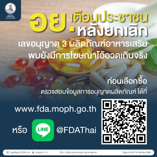 อย. เตือน ปชช. หลังยกเลิกเลขอนุญาต 3 ผลิตภัณฑ์อาหารเสริม พบยังมีการโฆษณาโอ้อวดเกินจริง