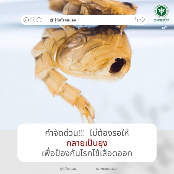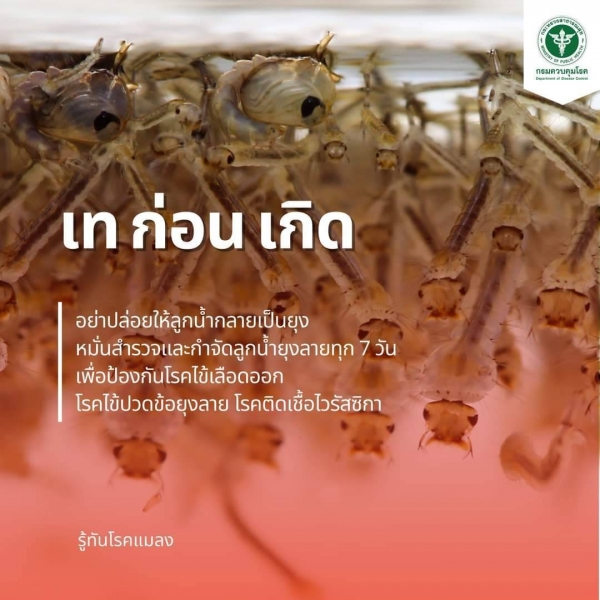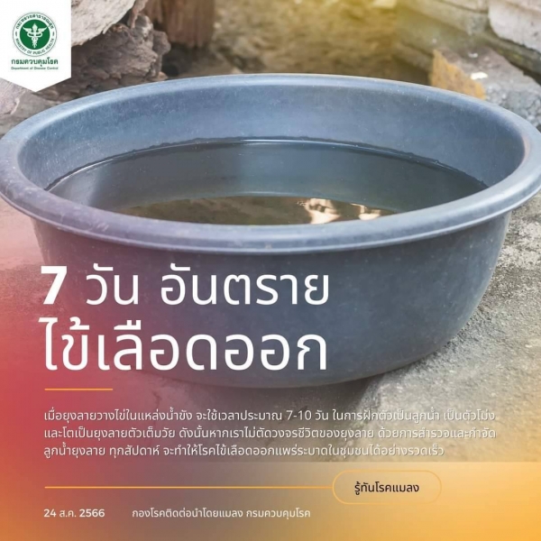 โรคไข้เลือดออก มียุงลายเป็นพาหะนำโรค โดยยุงลายไปกัดผู้ป่วยไข้เลือดออก แล้วไปกัดคนอื่นอีกต่อหนึ่ง โรคไข้เลือดออกเป็นแล้วกลับมาเป็นซ้ำได้อีก และการกลับมาเป็นไข้เลือดออกซ้ำ ความรุนแรงจะยิ่งมากขึ้น โอกาสเสียชีวิตก็มีสูงมากขึ้นเช่นกัน กำจัดด่วน!!! ไม่ต้องรอให้กลายเป็นยุง เพื่อป้องกันไข้เลือดออก เท ก่อนเกิด อย่าปล่อยให้ลูกน้ำกลายเป็นยุง หมั่นสำรวจและกำจัดลูกน้ำยุงลายทุก 7 วัน เพื่อป้องกันโรคไข้เลือดออก โรคไข้ปวดข้อยุงลาย โรคติดเชื้อไวรัสซิกา 7 วันอันตราย ไข้เลือดออก เมื่อยุงลายวางไข่ในแหล่งน้ำขัง จะใช้เวลาประมาณ 7-10 วัน ในการฝักตัวเป็นลูกน้ำ เป็นตัวโม่ง และโตเป็นยุงลายตัวเต็มวัย ดังนั้น หากเราไม่ตัดวงจรชีวิตของยุงลาย ด้วยการสำรวจและกำจัดลูกน้ำยุงลายทุกสัปดาห์ จะทำให้โรคไข้เลือดออกแพร่ระบาดในชุมชนได้อย่างรวดเร็ว #สำนักงานสาธารณสุขจังหวัดเพชรบุรี