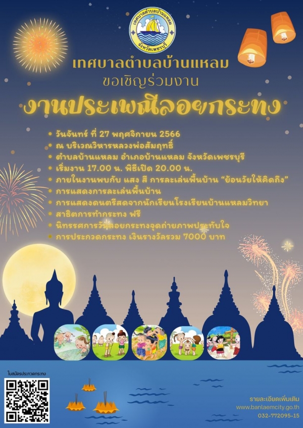 ขอเชิญร่วมงานสืบสานประเพณีลอยกระทง ประจำปี 2566 ณ บริเวณวิหารหลวงพ่อสัมฤทธิ์ วัดต้นสน อำเภอบ้านแหลม จังหวัดเพชรบุรี ในวันจันทร์ ที่ 27 พฤศจิกายน 2566