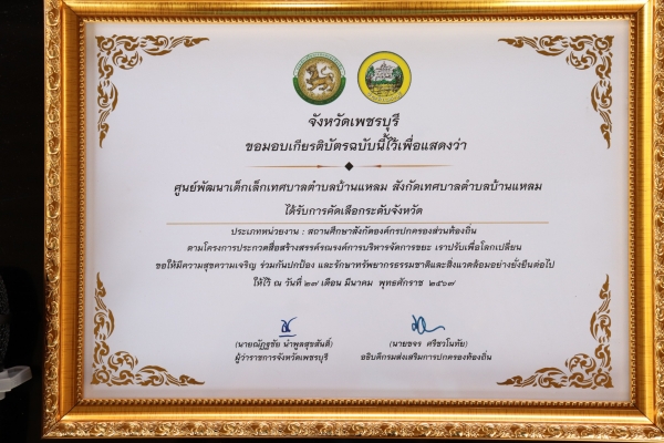 วันพุธที่ 27 มีนาคม 2567 เวลา 09.30 น. นายวัน เมฆอัคคี นายกเทศมนตรีตำบลบ้านแหลม มอบหมายให้นายประยุทธ สุขารมณ์ รองนายกเทศมนตรีตำบลบ้านแหลม เข้ารับเกียรติบัตร โดยศูนย์พัฒนาเด็กเล็กเทศบาลตำบลบ้านแหลม ได้รับการคัดเลือกระดับจังหวัดเพชรบุรี ประเภทหน่วยงาน : สถานศึกษาสังกัดองค์กรปกครองส่วนท้องถิ่น ตามโครงการประกวดสื่อสร้างสรรค์ รณรงค์การบริหารจัดการขยะ เราปรับเพื่อโลกเปลี่ยน ภายใต้แนวคิด "หนึ่งจิตสำนึกกับสองมือ : ปรับวิธีคิด เปลี่ยนพฤติกรรม ทำเพื่อโลกและท้องถิ่น"