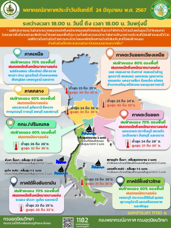 พยากรณ์อากาศประจำวันจันทร์ที่ 24 มิถุนายน 2567