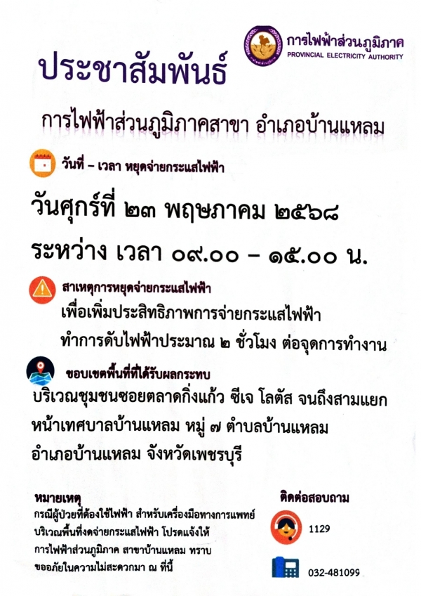 วันศุกร์ที่ 23 พฤษภาคม 2568 ระหว่างเวลา 09.00 -15.00 น. การไฟฟ้าหยุดจ่ายกระแสไฟฟ้าชั่วคราว พื้นที่ที่ได้รับผลกระทบ บริเวณชุมชนซอยตลาดกิ่งแก้ว ซีเจ โลตัส จนถึงสามแยกหน้าเทศบาล หมู่ 7 ตำบลบ้านแหลม
