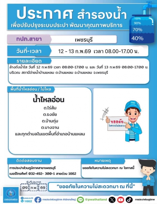 กปภ.เพชรบุรีประกาศสำรองน้ำวันที่ 12-13 ก.พ.2569