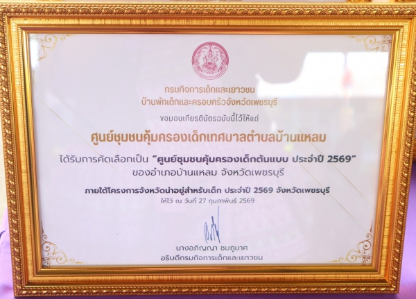 รับเกียรติบัตรเชิดชูเกียรติ "ศูนย์ชุมชนคุ้มครองเด็กต้นแบบ ประจำปี2569"