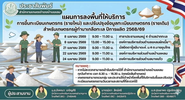 ขอเชิญชวนเกษตรกรผู้ทำนาเกลือทะเลทุกท่าน เข้ารับบริการขึ้นทะเบียนเกษตรกร (รายใหม่) และ ปรับปรุงข้อมูลทะเบียนเกษตรกร (รายเดิม) ประจำฤดูกาลผลิต ปี 2568/69