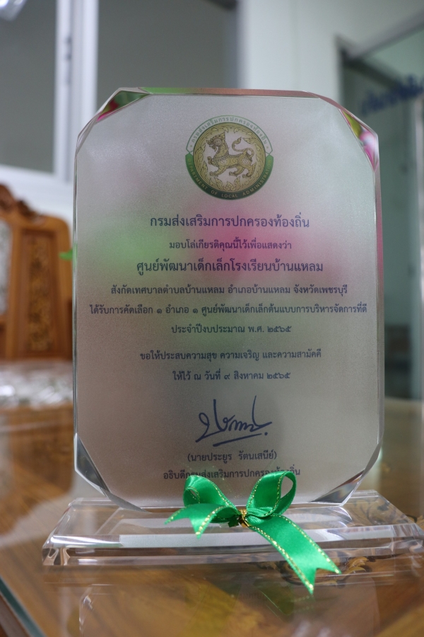 รับโล่เกียรติคุณสำหรับศูนย์พัฒนาเด็กเล็กต้นแบบการบริหารจัดการที่ดี ประจำปีงบประมาณ ๒๕๖๕