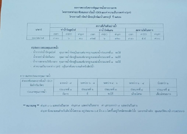 #ซึ่งผลการตรวจพบว่าคุณภาพน้ำจัดอยู่ประเภทที่3คุณภาพน้ำพอใช้ค่าpHอยู่ในช่วงที่เหมาะสมสำหรับสัตว์น้ำ