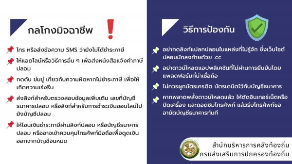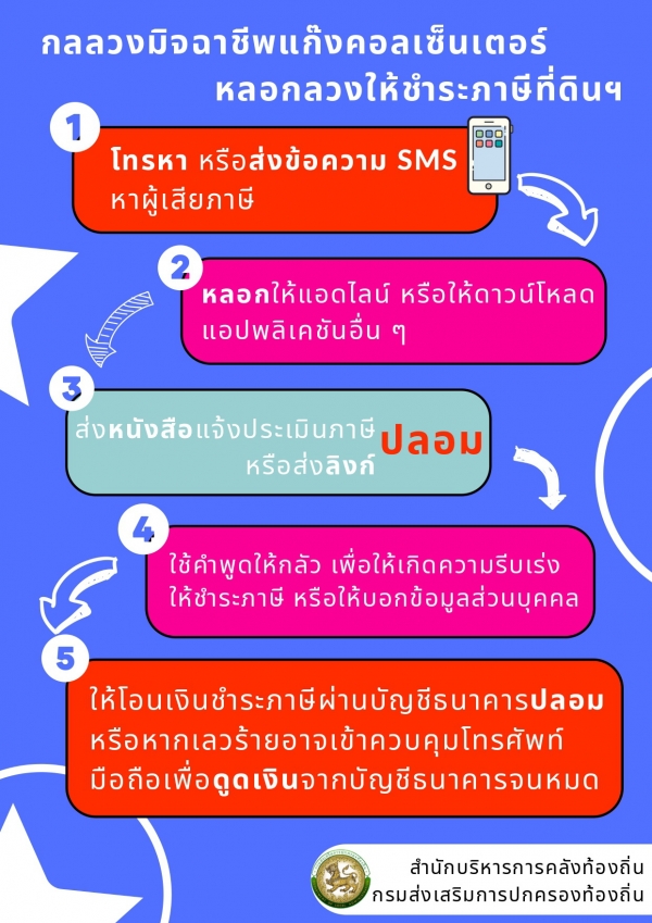 คำเตือนระวังกลลวงมิจฉาชีพแก๊งคอลเซ็นเตอร์ หลอกลวงให้ชำระภาษีที่ดินและสิ่งปลูกสร้าง
