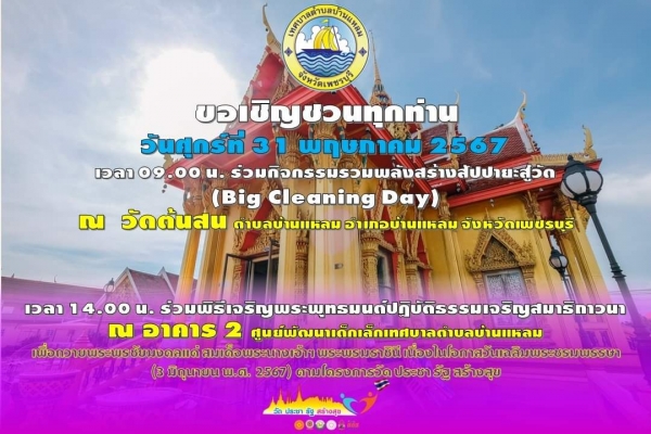 กองการศึกษาเทศบาลตำบลบ้านแหลม ขอเชิญชวนทุกท่าน ร่วมกิจกรรม "รวมพลังสร้างสัปปายะสู่วัดด้วยวิถี 5 ส (Big Cleaning Day)" ทำความสะอาดวัดต้นสน