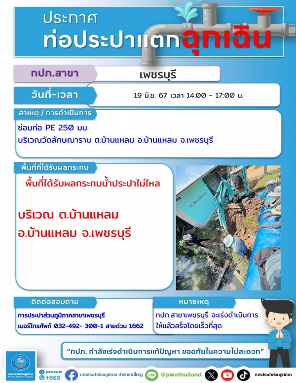 การประปาส่วนภูมิภาคสาขาเพชรบุรีจะทำการซ่อมบำรุงท่อจ่ายน้ำ จึงทำให้น้ำประปาไหลอ่อน