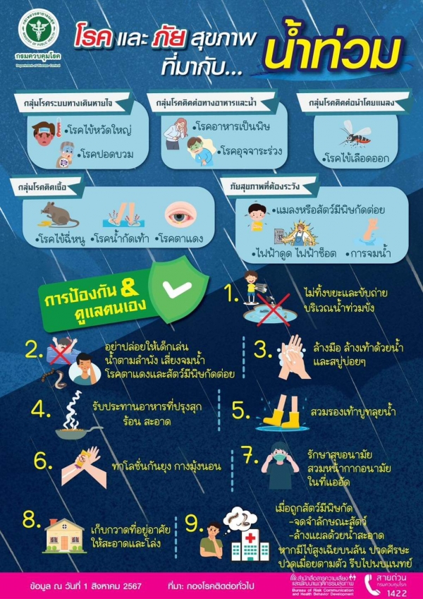 กรมควบคุมโรค ห่วงใยสุขภาพประชาชน ในพื้นที่น้ำท่วม แนะวิธีดูแลตนเอง ป้องกันการเจ็บป่วยจากกลุ่มโรคที่มากับน้ำท่วม ได้แก่ กลุ่มโรคระบบทางเดินหายใจ (โรคไข้หวัดใหญ่, โรคปอดบวม) กลุ่มโรคติดต่อทางอาหารและน้ำ (โรคอาหารเป็นพิษ, โรคอุจจาระร่วง) กลุ่มโรคติดเชื้อ (โรคไข้ฉี่หนู, น้ำกัดเท้า, โรคตาแดง) กลุ่มโรคติดต่อนำโดยแมลง (โรคไข้เลือดออก) รวมถึงภัยสุขภาพที่ไม่ควรประมาท ได้แก่ การจมน้ำ ไฟฟ้าดูด ไฟฟ้าช็อต แมลงสัตว์มีพิษกัดต่อย ที่มักเกิดช่วงน้ำท่วม