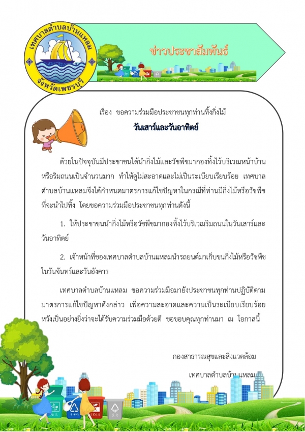 ขอความร่วมมือประชาชนทุกท่านทิ้งกิ่งไม้ในวันเสาร์และอาทิตย์