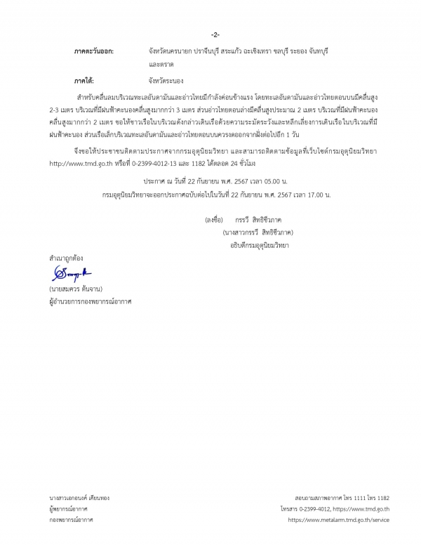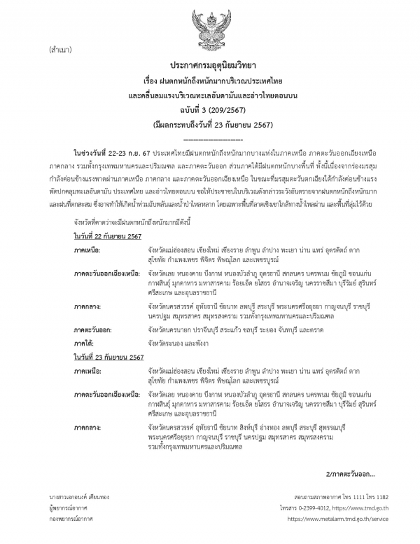 ประกาศกรมอุตุนิยมวิทยา เรื่อง ฝนตกหนักถึงหนักมากบริเวณประเทศไทย และคลื่นลมแรงบริเวณทะเลอันดามันและอ่าวไทยตอนบน ฉบับที่3