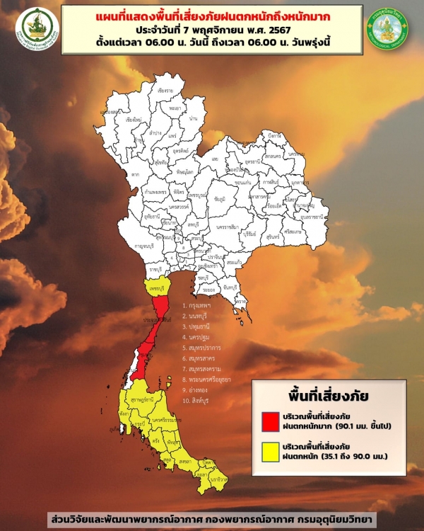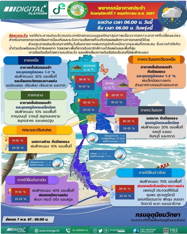 พยากรณ์อากาศประจำวันพฤหัสบดีที่ 7 พฤศจิกายน 2567 จากกรมอุตุนิยมวิทยา