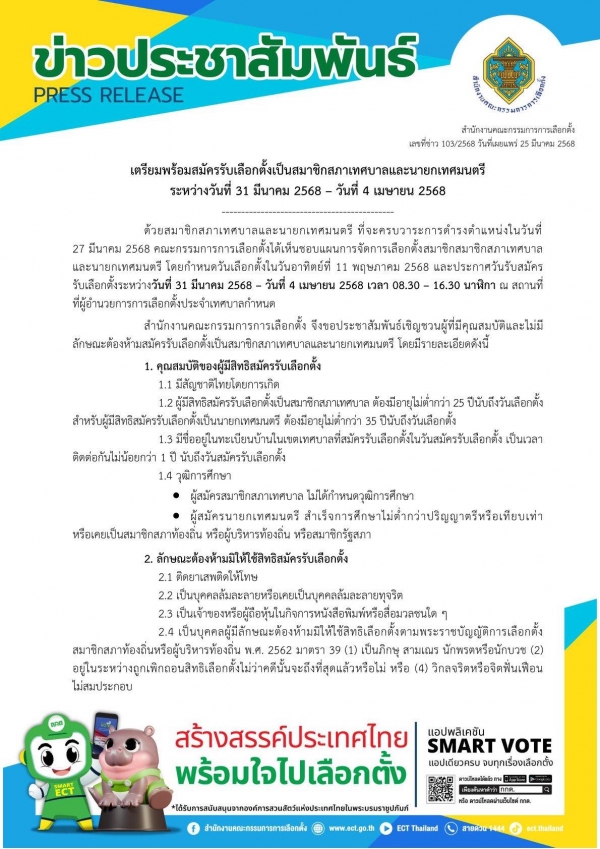 ประชาสัมพันธ์สำหรับผู้ที่มีความประสงค์จะสมัครรับเลือกตั้งเป็นสมาชิกสภาเทศบาลและนายกเทศมนตรี