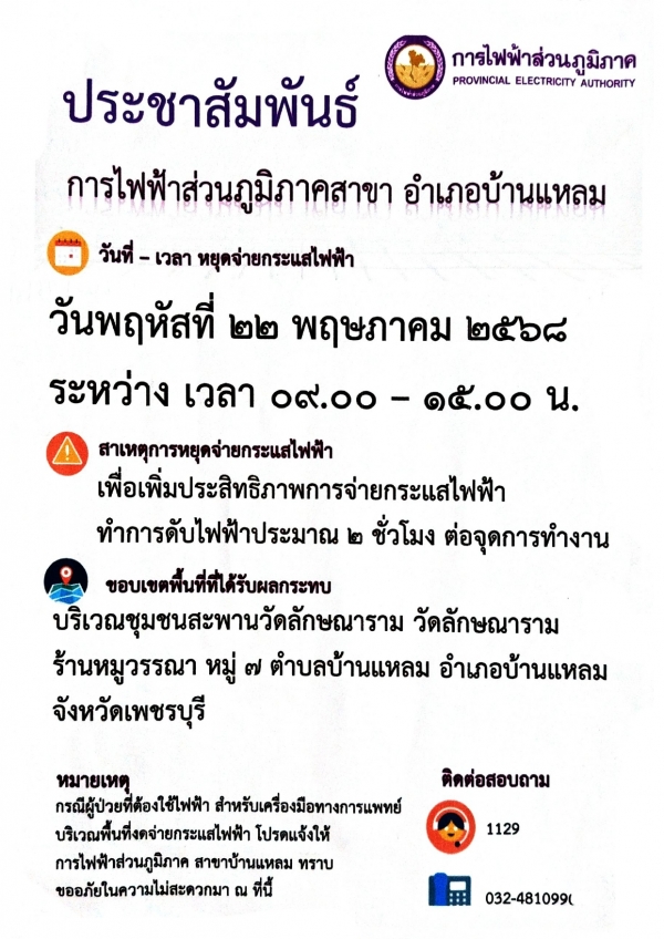 วันพฤหัสบดีที่ 22 พฤษภาคม 2568 ระหว่างเวลา 09.00 -15.00 น. การไฟฟ้าหยุดจ่ายกระแสไฟฟ้าชั่วคราว พื้นที่ที่ได้รับผลกระทบ บริเวณชุมชนสะพานวัดลักษณาราม วัดลักษณาราม ร้านหมูวรรณณา หมู่ 7 ต.บ้านแหลม