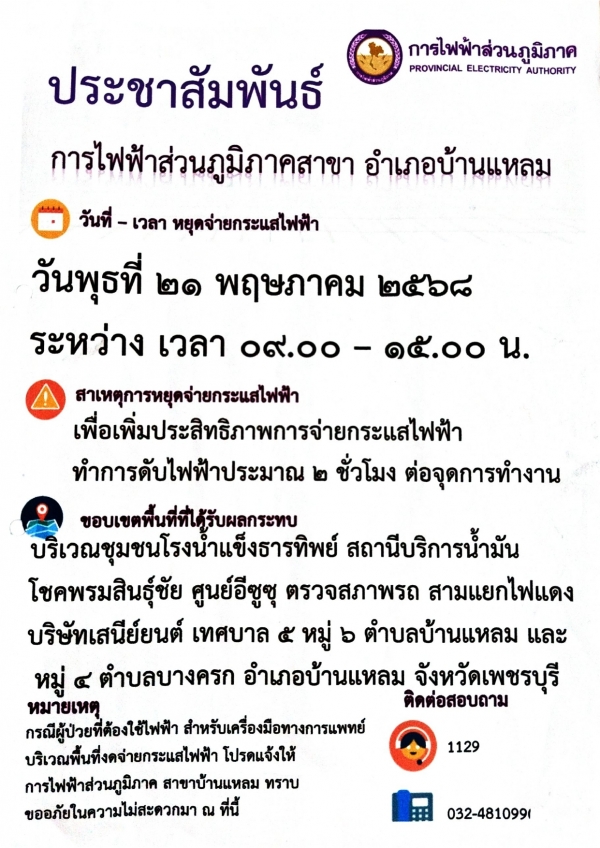 วันพุธที่ 21 พฤษภาคม 2568 ระหว่างเวลา 09.00 -15.00 น. การไฟฟ้าหยุดจ่ายกระแสไฟฟ้าชั่วคราว พื้นที่ที่ได้รับผลกระทบ บริเวณชุมชนโรงน้ำแข็งธารทิพ ปั๊มน้ำมันโชคพรมสินธุ์ชัย ศูนย์อีซูซุ ตรวจสภาพรถ สามแยกไฟแดง บริษัทเสนีย์ยนต์ หมู่ 6 ต.บ้านแหลม