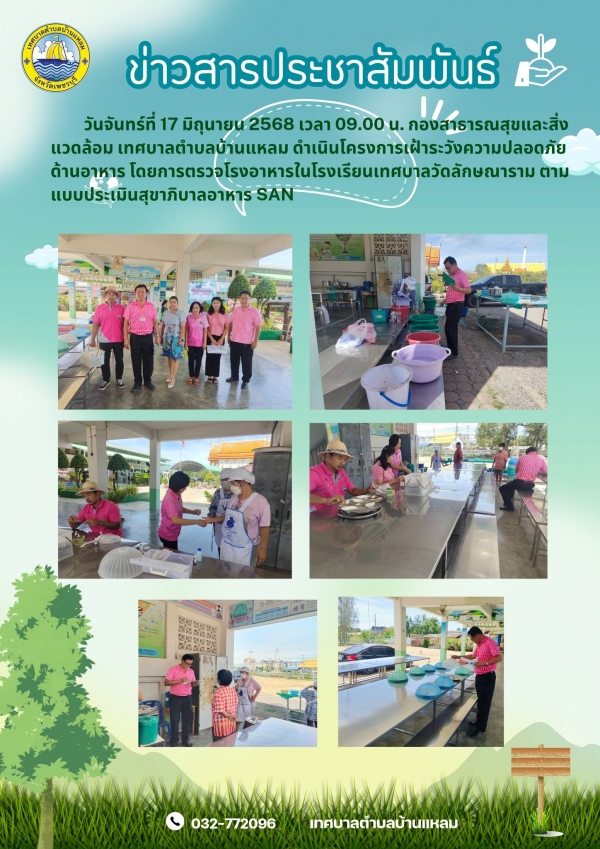 วันจันทร์ที่ 17 มิถุนายน 2568 เวลา 09.00 น. นายวัน เมฆอัคคี นายกเทศมนตรีตำบลบ้านแหลม มอบหมายให้เจ้าหน้าที่กองสาธารณสุขและสิ่งแวดล้อม เทศบาลตำบลบ้านแหลม ดำเนินโครงการเฝ้าระวังความปลอดภัยด้านอาหาร โดยการตรวจโรงอาหารในโรงเรียนเทศบาลวัดลักษณาราม ตามแบบประเมินสุขาภิบาลอาหาร SAN