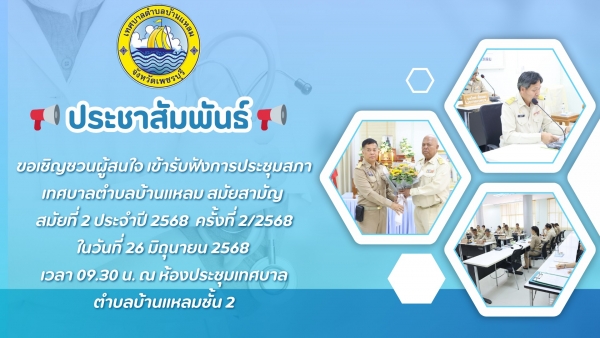เชิญชวนผู้สนใจเข้ารับฟัง การประชุมสภาเทศบาลตำบลบ้านแหลม สมัยสามัญ สมัยที่ 2 ประจำปี พ.ศ. 2568 ครั้งที่ 2