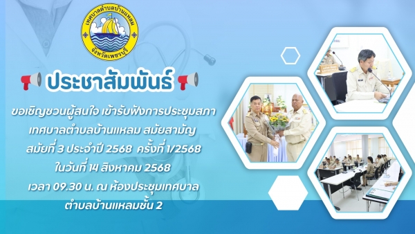 เชิญชวนผู้สนใจเข้ารับฟัง การประชุมสภาเทศบาลตำบลบ้านแหลม สมัยสามัญ สมัยที่ 3 ประจำปี พ.ศ. 2568 ครั้งที่ 1