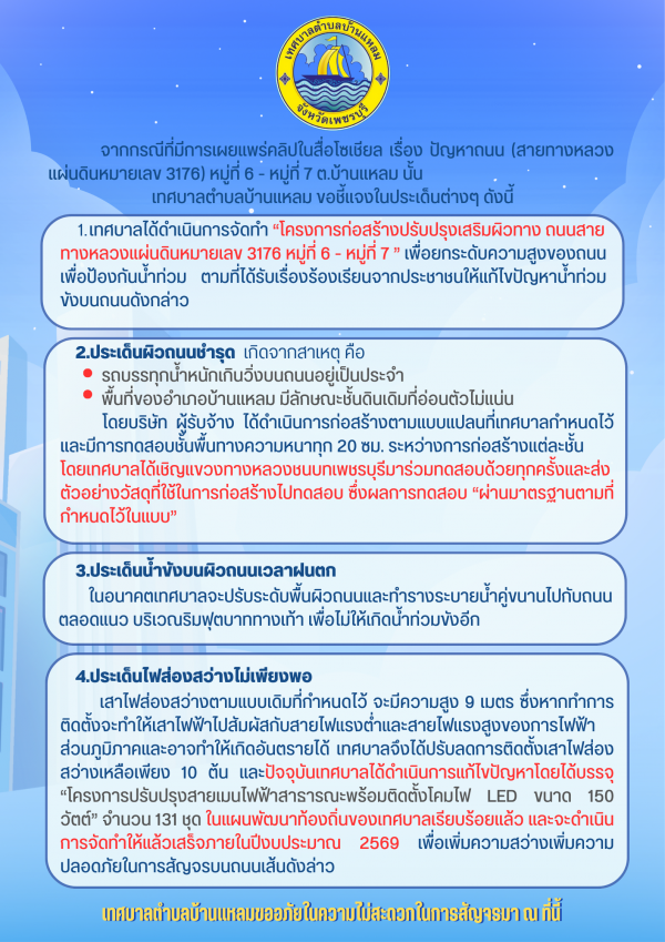 ขอชี้แจงในประเด็น เรื่อง ปัญหาถนน (สายทางหลวงแผ่นดินหมายเลข 3176) หมู่ที่ 6 - หมู่ที่ 7 ต.บ้านแหลม