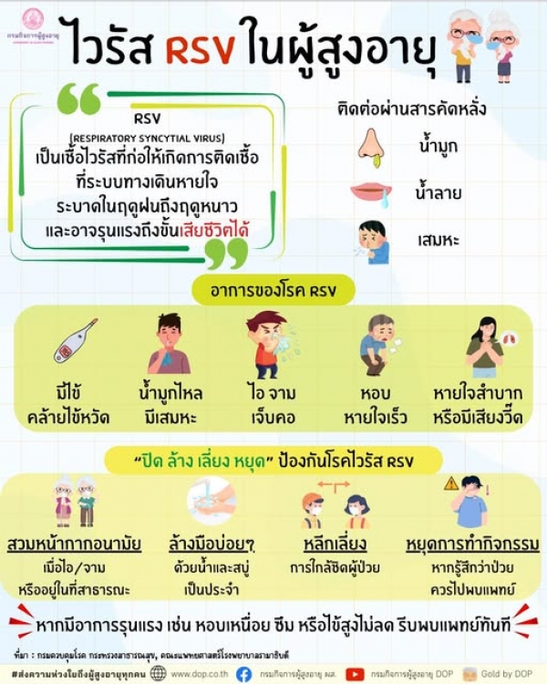 RSV (Respiratory Syncytial Virus) เป็นสาเหตุหลักของการเกิดปอดอักเสบรุนแรงในเด็กและผู้สูงอายุ มักพบโรคติดเชื้อไวรัส RSV ในช่วงฤดูฝนและฤดูหนาวซึ่งเป็นช่วงเดียวกับฤดูกาลระบาดของโรคไข้หวัดใหญ่ นอกจากนี้ อาการและการติดต่อมีความคล้ายกัน โดยปัจจัยที่ทำให้การแพร่ระบาดได้อย่างรวดเร็วนั้น เนื่องจากเชื้อไวรัสจะมีชีวิตอยู่ภายนอกร่างกายได้เป็นเวลานานหลายชั่วโมงโดยอาศัยอยู่ตามวัตถุต่าง ๆ และเชื้อแพร่กระจายได้ง่ายผ่านน้ำมูก น้ำลาย การไอ หรือจาม เช่นเดียวกับโรคติดต่อระบบทางเดินหายใจอื่น ๆ อาการของโรคเริ่มต้นคล้ายไข้หวัดธรรมดา คือ มีไข้ ไอ จาม มีน้ำมูก เจ็บคอ แต่หากพบอาการหายใจเร็ว หอบเหนื่อย หรือหายใจมีเสียงหวีด (Wheezing) หายใจลำบาก หน้าอกบุ๋ม ซึมลง รับประทานอาหารได้น้อยลง และในเด็ก มีอาการเล่นน้อยลง ไม่ดูดนม ควรรีบพาผู้ป่วยไปพบแพทย์โดยเร็วเพื่อรับการรักษาอย่างทันท่วงที ป้องกันได้ด้วยหลัก “ปิด ล้าง เลี่ยง หยุด” 1. สวมหน้ากากอนามัยเมื่อไอ/จาม หรืออยู่ในที่สาธารณะ 2. ล้างมือบ่อย ๆ ด้วยน้ำและสบู่เป็นประจำ 3. หลีกเลี่ยงใกล้ชิดผู้ป่วย 4. หากป่วยควรหยุดเรียน-หยุดงาน และรีบพบแพทย์
