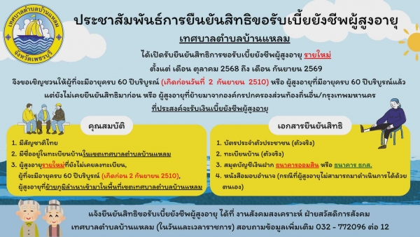 เทศบาลตำบลบ้านแหลม เปิดลงทะเบียนยืนยันสิทธิขอรับเบี้ยยังชีพผู้สูงอายุ รายใหม่ ตั้งแต่เดือนตุลาคม 2568 ถึง เดือนกันยายน 2569 จึงขอเชิญชวนผู้ที่จะมีอายุครบ 60 ปีบริบูรณ์ (เกิดก่อนวันที่ 2 กันยายน 2510) หรือผู้สูงอายุที่มีอายุครบ 60 ปีบริบูรณ์
