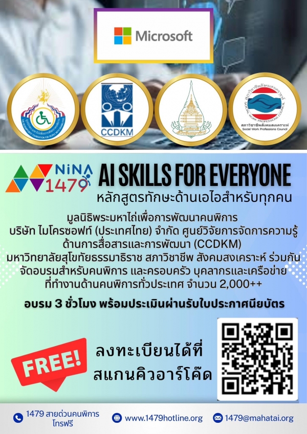 อบรมฟรี! “AI Skills for Everyone” เสริมทักษะด้านเอไอ สำหรับคนพิการและผู้ทำงานด้านคนพิการทั่วประเทศ ให้มีศักยภาพก้าวทันต่อการเปลี่ยนแปลงของโลกดิจิทัล อบรมเพียง 3 ชั่วโมง รับประกาศนียบัตร และ ลงทะเบียนได้ที่สแกนคิวอาร์โค๊ด ค่ะ