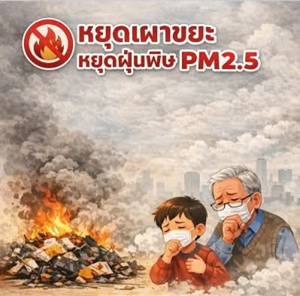 หยุดเผาขยะ หยุดฝุ่นพิษ PM2.5 รู้หรือไม่? การเผาขยะในที่โล่งเป็นสาเหตุสำคัญของฝุ่นละอองขนาดเล็ก PM2.5 ที่ส่งผลกระทบต่อสุขภาพ ทำให้เกิดโรคระบบทางเดินหายใจ ภูมิแพ้ เพิ่มความเสี่ยงต่อโรคเรื้อรัง และสร้างมลพิษทางอากาศที่กระทบต่อสิ่งแวดล้อมและคุณภาพชีวิตของทุกคนในชุมชน ขอความร่วมมือประชาชน งดการเผาขยะในที่โล่งร่วมกันคัดแยกขยะ นำกลับมาใช้ใหม่ และกำจัดขยะอย่างถูกวิธี เพื่อช่วยลดมลพิษ สร้างอากาศสะอาด และดูแลสุขภาพของตนเอง ครอบครัว และสังคมโดยรวม อากาศสะอาด เริ่มต้นที่เรา ไม่เผาขยะในที่โล่ง
