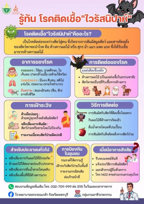 รู้ทัน “โรคติดเชื้อไวรัสนิปาห์” เพื่อความปลอดภัยของทุกคน โรคติดต่อจากสัตว์สู่คนที่อาจเริ่มจากอาการคล้ายไข้หวัด แต่สามารถรุนแรงถึงขั้นอันตรายต่อชีวิตได้ ขอให้ประชาชนร่วมกันเฝ้าระวัง หลีกเลี่ยงการสัมผัสสัตว์ป่วย ล้างมือบ่อย ๆ และเลือกรับประทานอาหารที่สะอาด