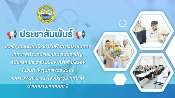 เชิญชวนผู้สนใจเข้ารับฟัง การประชุมสภาเทศบาลตำบลบ้านแหลม สมัยสามัญ สมัยแรก ประจำปี พ.ศ. 2569 ครั้งที่ 1