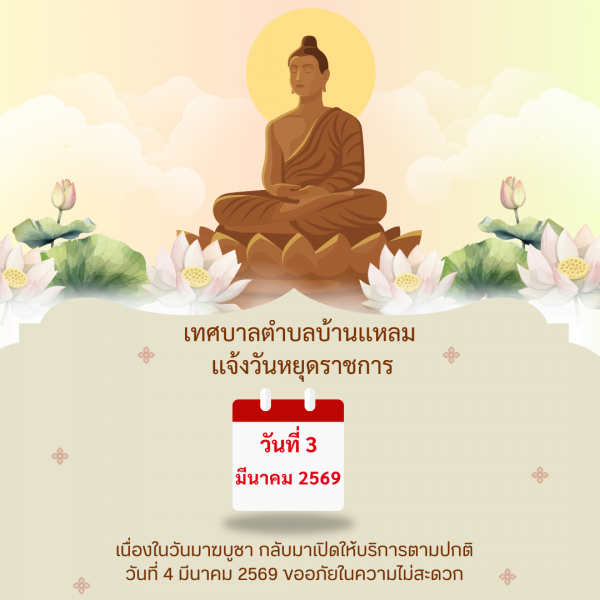 ประกาศเทศบาลตำบลบ้านแหลมวันหยุดราชการเนื่องในวันมาฆบูชาวันอังคารที่ 3 มีนาคม 2569 เทศบาลตำบลบ้านแหลม