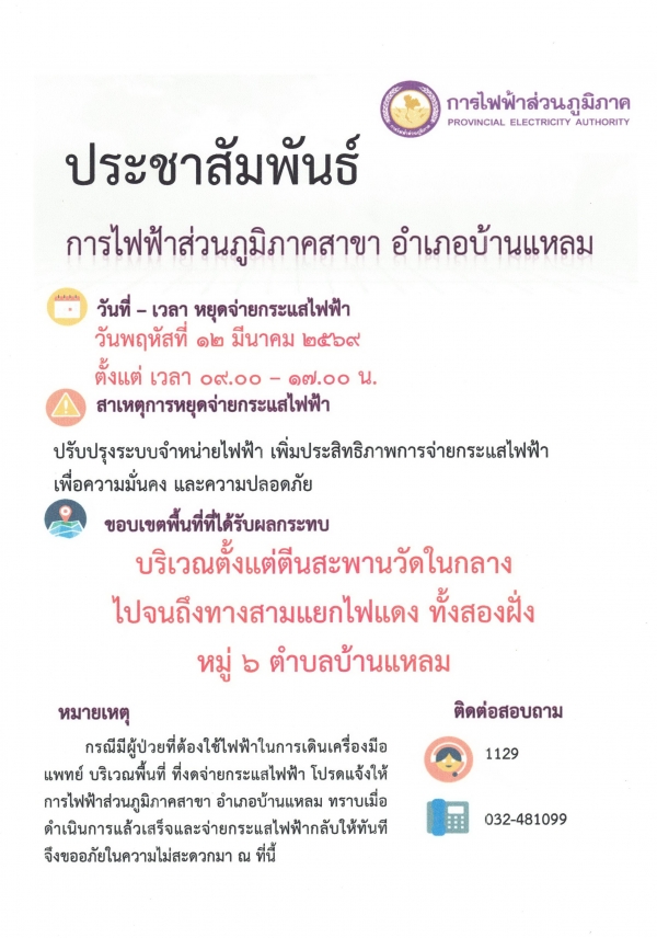 ประชาสัมพันธ์การไฟฟ้าส่วนภูมิภาคสาขาอำเภอบ้านแหลม ประกาศ ในวันพฤหัสบดีที่ 12 มีนาคม 2569 เวลา 09.00-17.00 น. จำเป็นต้องหยุดจ่ายกระแสไฟฟ้า เพื่อทำการปรับปรุงระบบจำหน่ายไฟฟ้า พื้นที่ที่ได้รับผลกระทบ บริเวณตั้งแต่ตีนสะพานวัดในกลาง ไปจนถึงสามแยกไฟแดงทั้งสองฝั่ง หมูที่ 6 ต.บ้านแหลม หมายเหตุ กรณีผู้ป่วยที่ต้องใช้ไฟฟ้าในการเดินเครื่องมือแพทย์ บริเวณพื้นที่ที่งดจ่ายกระแสไฟฟ้า โปรดแจ้งให้การไฟฟ้าทราบ....โทร 032-481099